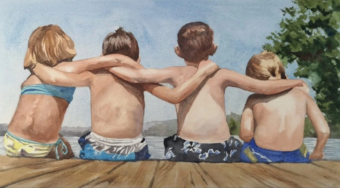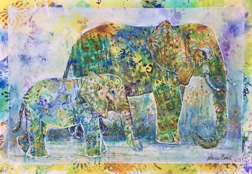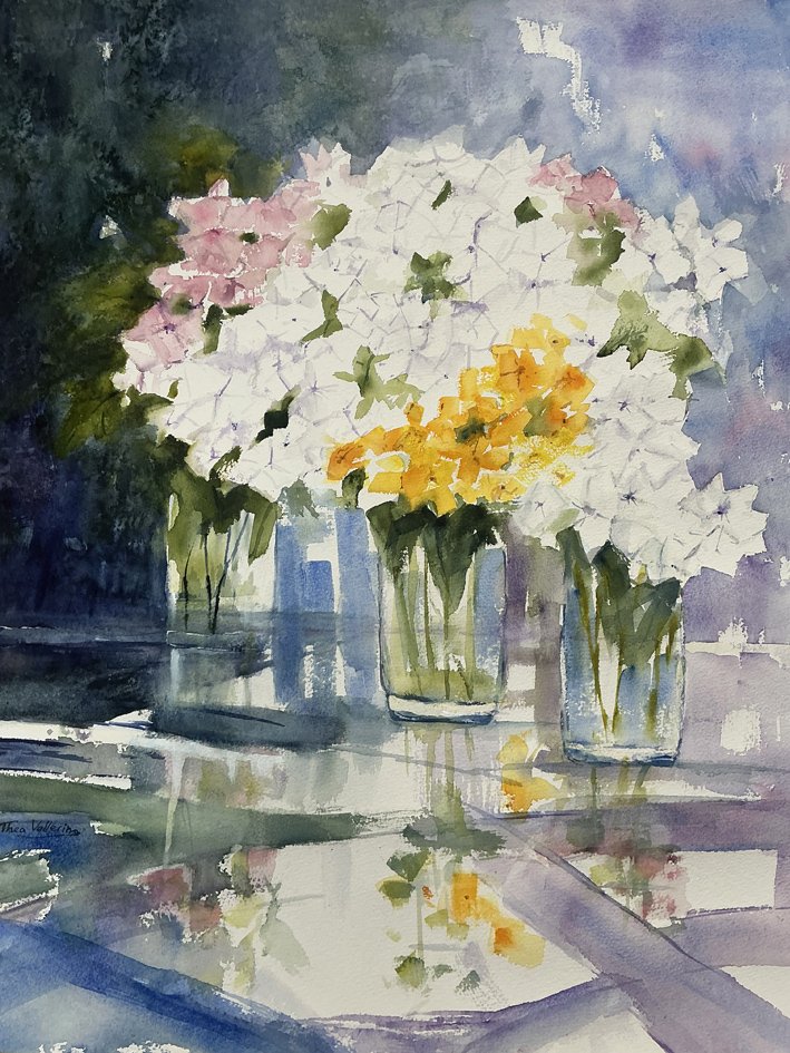 Three in a Row by Thea Hodgson, watercolour, 66 x 56 x 1.5 cm